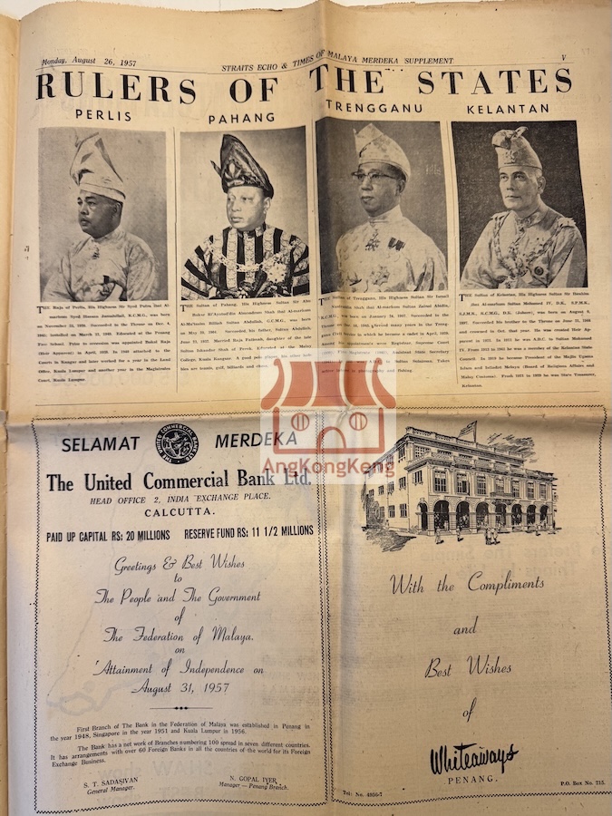 1957年独立日特刊 Straits Echo & Times of Malaya Merdeka Supplement 1957 旧报纸档案 Next Article 新加坡华人庆新年 Singapore Chinese Celebrate New Year-The Straits Times 1939Feb21 请评级 投票1 投票2 投票3 投票4 投票5 1957年独立日特刊 Monday, August 26, 1957 Straits Echo & Times of Malaya Merdeka Supplement 此乃我们收藏的旧报纸,只拍几页供参考!!! Next Article 新加坡华人庆新年 Singapore Chinese Celebrate New Year-The Straits Times 1939Feb21